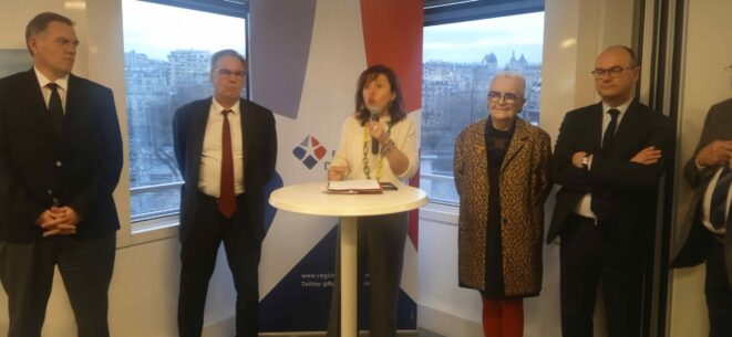 La présidente de l’Association des Régions de France, Carole Delga entourée de plusieurs ministres Philippe Tabarot ministre des Transports, Sébastien Martin Ministre chargé de l’Industrie de France,  Françoise Gatel ministre de l’Aménagement du territoire, Michel Fournier ministre de la ruralité,  présentait ses vœux.