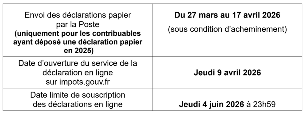 Pour les usagers ne pouvant pas déclarer en ligne, la date limite de dépôt des déclarations est fixée au mardi 19 mai 2026 à 23h59 (y compris pour les résidents français à l’étranger), le cachet de La Poste faisant foi.