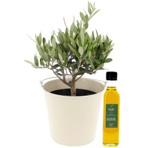 Olivier (hauteur 35cm) dans son pot en zinc, accompagné de sa bouteille d’huile d’olive de 25cl du domaine des hauts de Riganel.